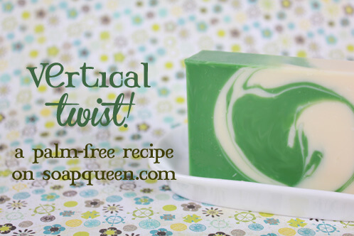 Have you ever had one of those moments where you felt like testing your (soaping) boundaries to see how far you could take something but feared you would ruin an entire batch of soap? We’ve done a vertical twist project before, and it turned out awesome. But I wondered, what if we just kept on twisting the divider…? Ahem. It was new levels of soap happiness. If you’re a tactile learner and you’d like to see/hold/touch/smell this soap and experience it in person, we’ve put it in our etsy shop here so you can learn to make this palm-free soap.
