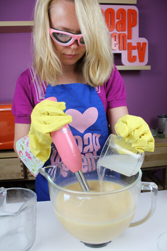 THREE: Add salt water solution and mix well using a stick blender, or switch to a whisk if trace is accelerating.