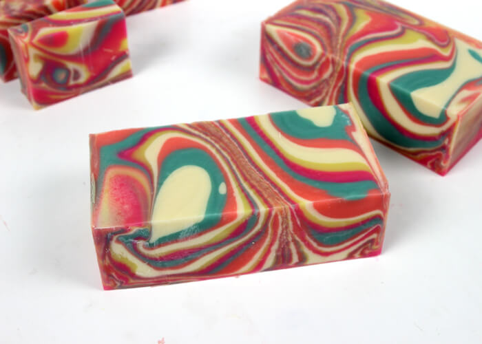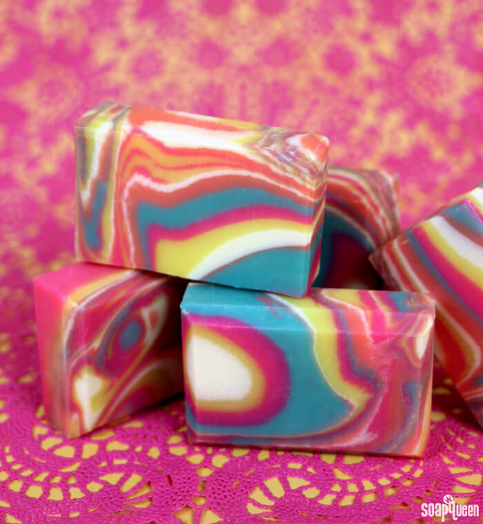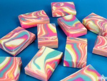 TWELVE: Keep spinning the mold until the colors have begun to create patterns due to the spin and stop motion. A good place to stop is when the colors begin to blend together. You can see this beginning to happen in the bottom corner of the mold in the photo below. Once you’re happy with the spin effect, spray the top of the soap with 99% isopropyl alcohol to help avoid soda ash. Because I want the colors of this soap to really pop, I ensured gel phase by placing it on a heating pad for 20-30 minutes, and insulating it for 24 hours. Read more about insulating your soap here. Remove from the mold after 3-4 days, cut, and allow to cure for 4-6 weeks.