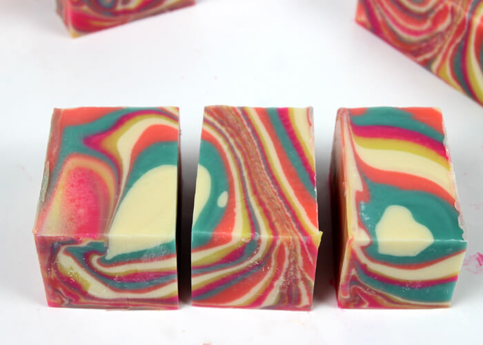 - For this design, I prefer to cut my soap horizontally. I feel this really highlights the movement within the swirl. To cut your soap horizontally, first cut the slab into three large pieces down the length of the mold. From each of these three pieces, you will get six bars.
