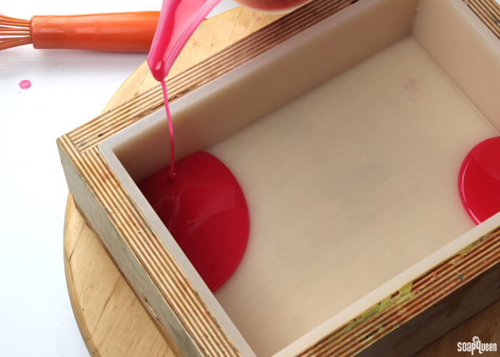 - Begin pouring the pink soap into two corners across from each other in the mold. Count to three for each pour to help make sure the pour is even on both sides.
