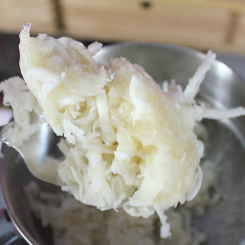 THREE: Keep stirring as the soap melts (still on medium heat). You’ll start to notice the soap looking very similar to mashed potatoes. If that’s the case you’re right on track! If it seems a little dryer than mashed potatoes, try adding a little more water to the base and stir.