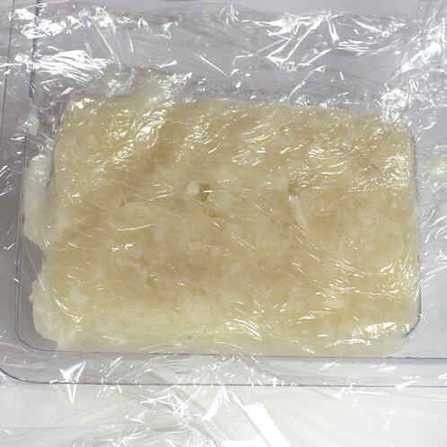 FOUR:  After the fragrance and water is fully incorporated into the soap, and you have your “mashed potato” consistency, glop the soap into the mold and cover it with plastic wrap to smooth out the back of the soap.