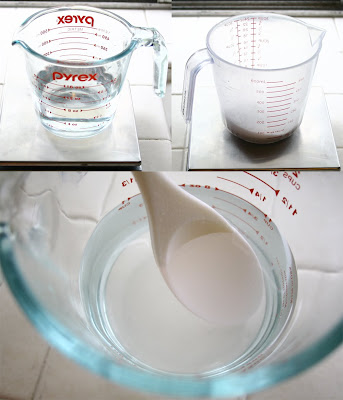5) In your 2 cup glass measuring glass weigh out your water, set aside. In your 2 cup glass or plastic measuring cup weigh out sodium hydroxide. VERY IMPORTANT: in a well ventilated area mix the sodium hydroxide into the water (never the other way around). Be sure not to inhale any of the fumes as they are toxic. Stir with your plastic spoon until the solution is clear and all of the sodium hydroxide is dissolved – about 2 minutes. Set aside with your thermometer and wait for the temp to reach 100 degrees. Start with ice water to expedite this part!