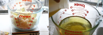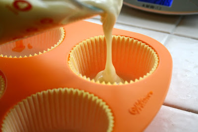 1) Get everything out and within easy reach. Line the cupcake mold with paper liners, cut the tip of the plastic disposable decorating bag so that the plastic star tip fits in it, weigh out your 1 oz of fragrance oils and set aside ( I like to save empty fragrance oil bottles for this), double check that you have all of your supplies ready.