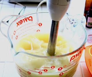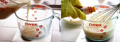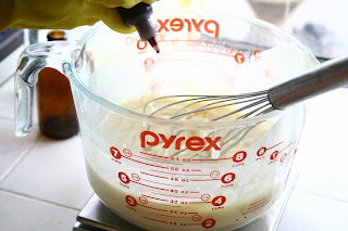 6) Once the sodium hydroxide is just above 100 degrees, take the temperature of your oils and make sure they are also at 100 degrees. If it is too hot pop the container in an ice water bath and if it is too cool pop in the microwave for just a few seconds at a time. NOTE: temperatures can be within 5 degrees of each other.Slowly mix the sodium hydroxide solution into the oils while mixing with the same plastic spoon you used to mix the sodium hydroxide solution. Finish off by mixing with your stick blender until you achieve a light trace (looks like thin pudding). This took me about 1 minute.