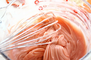 8) To the remaining soap add your 1 oz of Strawberry FO, and 40 drops of Flamingo Pink labcolor or until you get a pink that you like. The soap should be getting pretty thick at this point. Stir with your whisk until the soap is very thick and can hold shape.