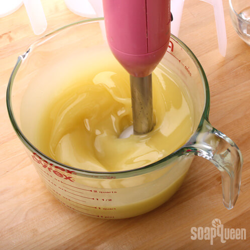 ONE: Slowly and carefully add the lye to the water and gently stir until the lye has fully dissolved and the liquid is clear. Set aside to cool.