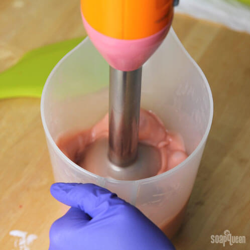 EIGHT: After you’ve poured two grey layers, pour the orange layer. Stick blend to thick trace.