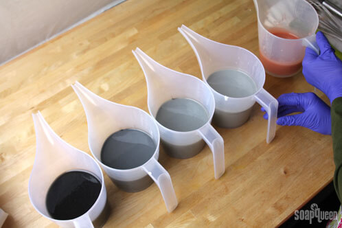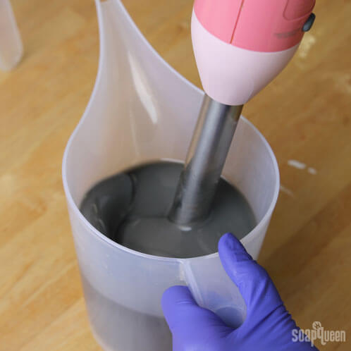 TEN: Resume pouring the grey layers. Stick blend the third grey container to thick trace and then pour.