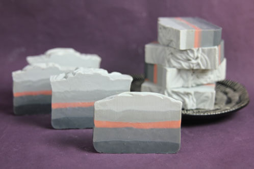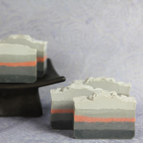 For this sensuous soap, we may or may not have been inspired by a certain best-selling book that references multiple (or 50) shades of grey in its name. This Smoky Bay soap features clean, straight layers colored with four perfect gradients of grey. The orange in the middle provides the perfect burst of color!