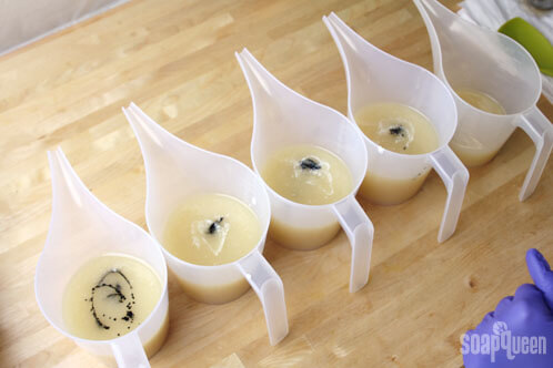 COLOR PREP: Disperse 2 teaspoons of Titanium Dioxoide and 2 teaspoons of Black Oxide into 2 tablespoon of liquid oil each (we like Sweet Almond or Sunflower). Disperse 1 teaspoon of Tangerine Wow and 1 teaspoon of Brick Red into 1 tablespoon of oil each. Prepping your colors in the beginning will allow you to work quickly and give you more time to work with your soap. Use the mini mixer to get all those clumps worked out smoothly.