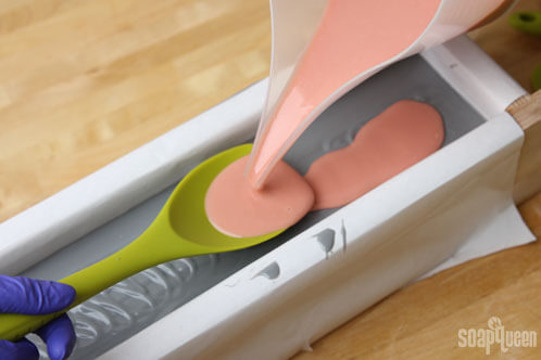 NINE: Gently pour the orange soap into the mold. You might also want to pour over a spatula or spoon so as to not break through the layers below.
