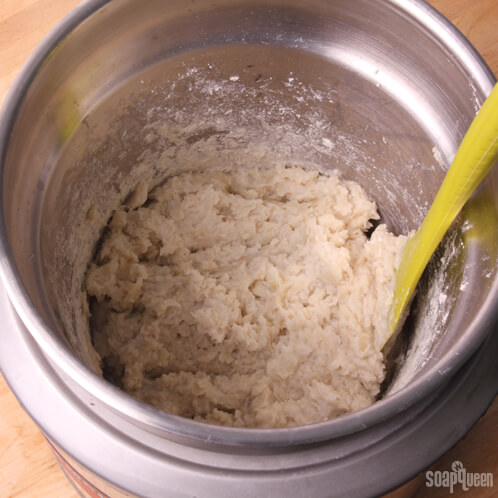 SIX: Now play the waiting game! After about 20 minutes, the rebatch will start to thicken into a gloppy oatmeal-like texture. That’s what you want. You want to keep your rebatch hydrated, so you may need to add a little extra water if you notice any cracking or if the mixture turns to a clay-like consistency. Keep in mind that the more liquid you add, the softer the soap will be, and the more difficult to pop out of the mold.
