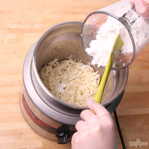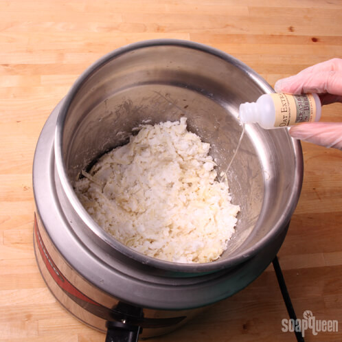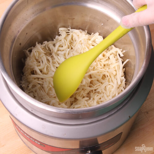 ONE: The rebatch you order from Bramble Berry comes pre-shredded, so you won’t need to worry about that. Set your double boiler on medium heat and add the rebatch. Let the rebatch sit and move on to step 2.