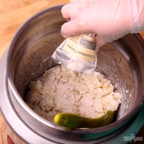 FOUR: Add the Colloidal Oatmeal. At this point, the rebatch should start to melt down into more of a paste. If it hasn’t, keep stirring and turn up the heat slightly on the double-boiler.