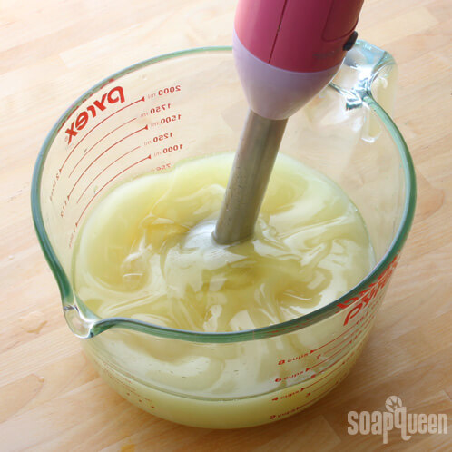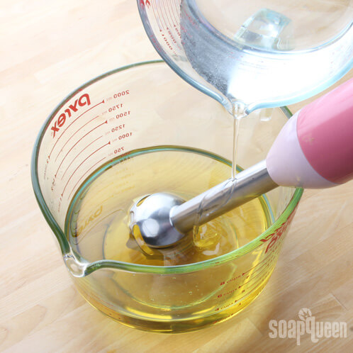 ONE: Slowly and carefully add the lye to the water and gently stir until the lye has fully dissolved and the liquid is clear. Set aside to cool.