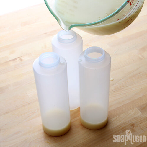 THREE: Reserve some soap to make the “eyes” by pouring off about 1 oz. of batter each into three condiment containers.