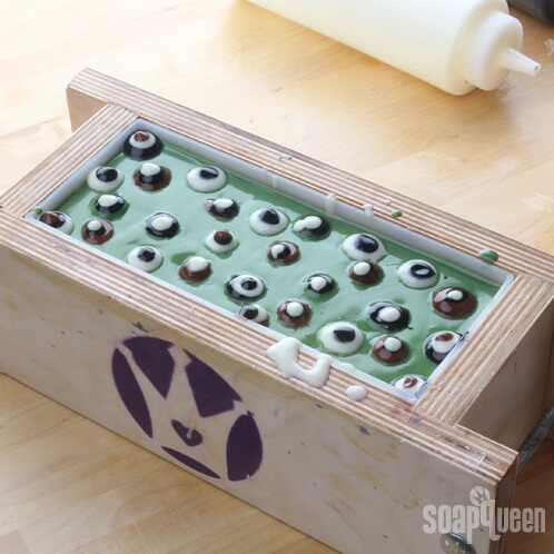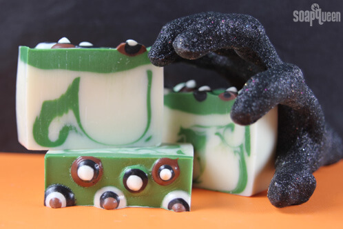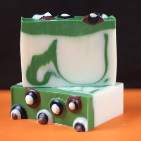 Sure it’s August, but with a 4-6 week cure time, it’s not too early to start prepping for the holiday season. If the holiday of ghouls, ghosts and things that go bump in the night is your thing, this whimsically creepy eyeball-inspired soap may be right up your (dark) alley. This soap incorporates a simple swirl technique, as well as the use of condiment bottles to create the cutely creepy “eyes” on top. We fragranced this soap with the Tart Apple Fragrance Oil, which was chosen by our 2013 S.O.A.P. Panel for its distinctive tart, fruity notes. In this soap, it brightened up the darker Fall color scheme, which is one more reason this soap is perfectly festive for Fall!