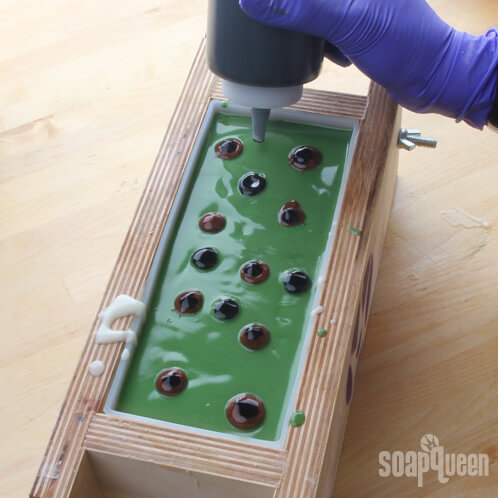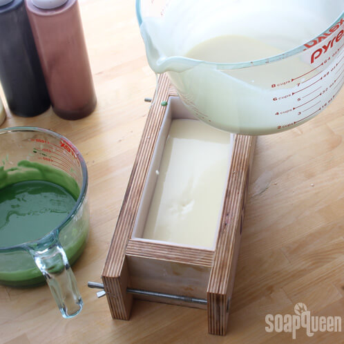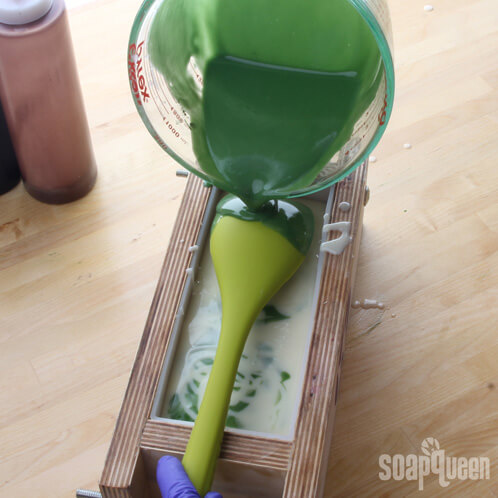 NINE: From a high point, pour about 1/3 of the green soap into the center of the  mold. Pouring from high up will create the streaks of green color you see in the final soap.
