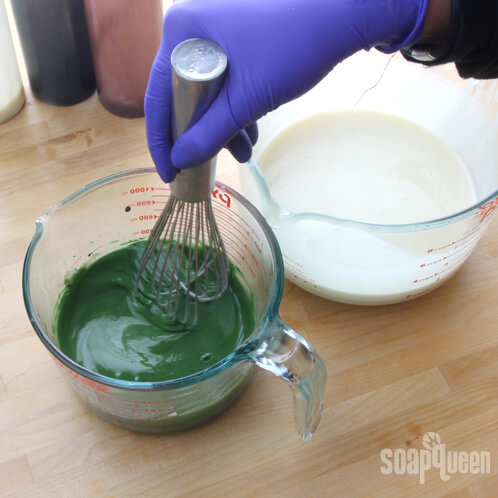 SIX: In your newly poured container, whisk in 1 teaspoon of dispersed green colorant. In the original container, whisk in 2 teaspoons of dispersed white colorant. The white helps to provide fantastic contrast to the deep green.