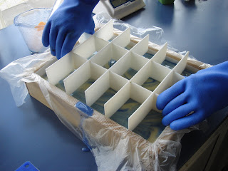 Putting the Sunnybrook soap mold dividers into the mold is easy if you squeeze the outside two plastic pieces to hold the entire puzzle of inserts together.