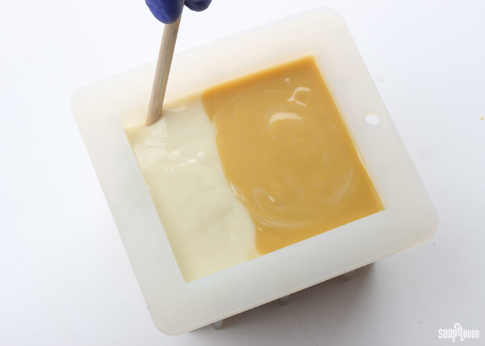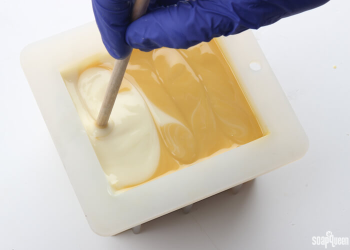 - Insert a chopstick or dowel down to the bottom of the mold. Then, move the dowel back and forth horizontally through the soap, making about four or five motions.