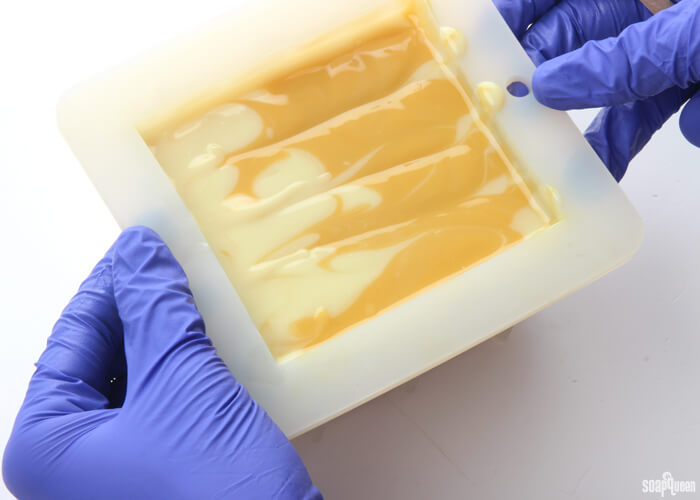 The vertical stripes are achieved by pouring the white and yellow soap into opposite ends of the mold at the same time. The colors are then swirled back and forth with a chopstick or dowel which pulls the colors into the other colored area. This technique is great for beginners, as you do not have to be precise when swirling.