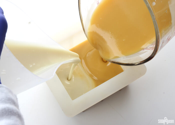 - At the same time, pour each color into opposite sides of the mold. At this point, your soap will be a medium trace. If it is still thin, give it a few short pulses with the stick blender to thicken. If the soap is poured while thin, the two colors may blend together too much, and the colors may become muddled.
