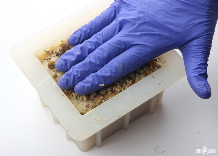 - Sprinkle chamomile herbs on top of the soap, and press them down gently to ensure they adhere.