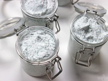 The base of this scrub is Foaming Bath Butter. It’s a premade base that when whipped with a hand or stand mixer, transforms into a light and fluffy consistency. It is made of gentle surfactants that mildly cleanse the skin. To the base, a combination of Fine Grained Dead Sea Salt and Forest Green Jojoba Beads are added. The jojoba beads add a light green color and gentle exfoliation. Learn more about jojoba beads here, and how they differ from microbeads.
