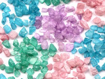First, drop fragrance oil onto the extra large bath crystals to give them scent. A bit of Polysorbate 80 helps the mica disperse throughout the tub water more evenly. Then, coat the crystals lightly in micas and glitter. This project can be customized with any skin-safe fragrance oil and mica of your choice. This tutorial used Celestial Waters Fragrance Oil and Queen’s Purple Mica for an amethyst effect. The other colors shown were created with Shamrock Green Mica scented with Clover & Aloe Fragrance Oil, Rose Gold Mica scented with Rosehip Jasmine Fragrance Oil and Caribbean Blue Mica scented with Rain Cybilla Fragrance Oil.