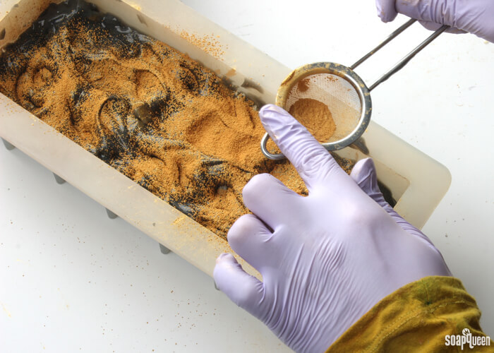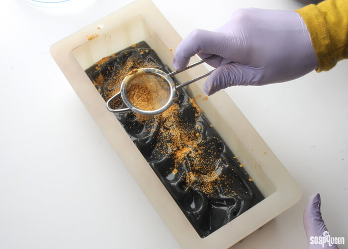 - Using a dropper, add drops of the dispersed King’s Gold Mica onto the top of the soap. Don’t worry too much about where each drop lands, just make sure they are somewhat evenly dispersed throughout the loaf.