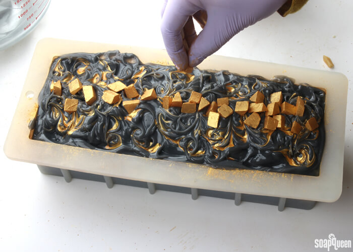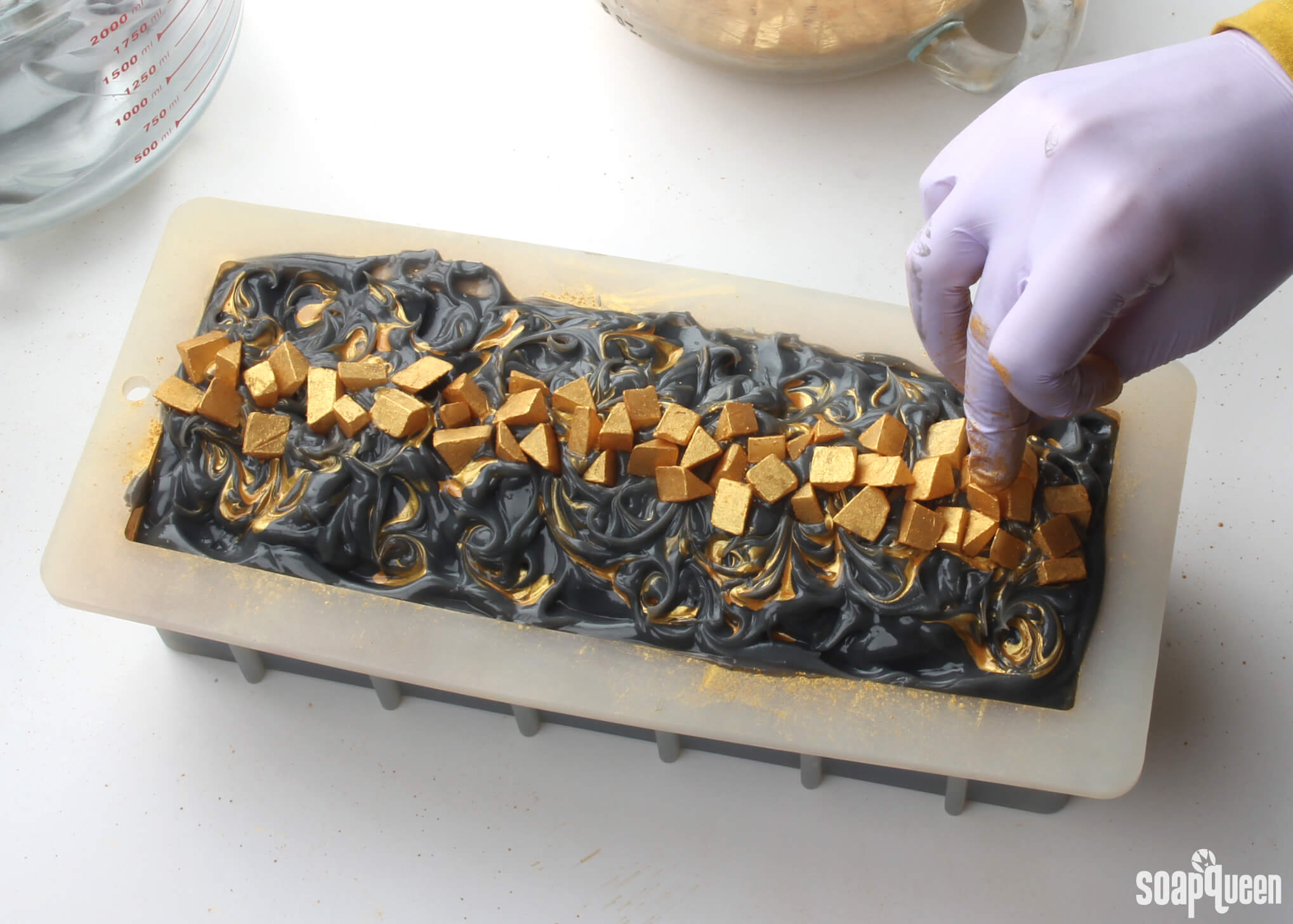 - Once you’re happy with the swirls, place the melt and pour embed chunks that are covered with King’s Gold Mica onto the center of the loaf. Press the embeds very gently into the soap to make sure the embeds stick. Continue to place them into the soap until you’re happy with the look.