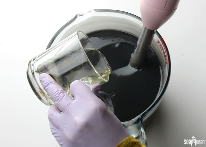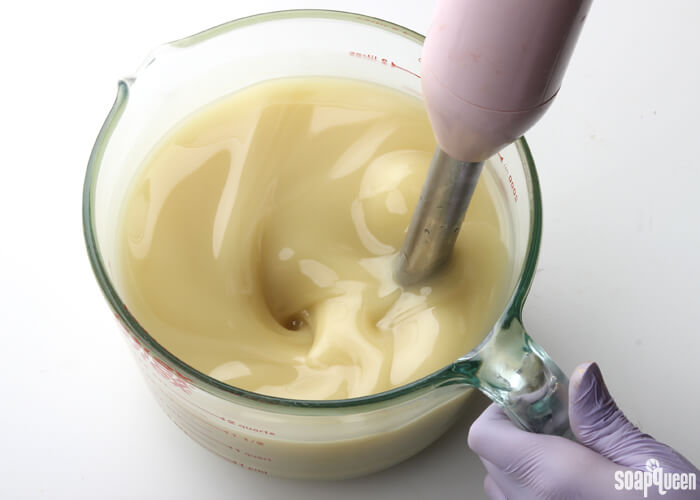- Add the entire fragrance blend and use the stick blender to achieve a medium/thick trace.