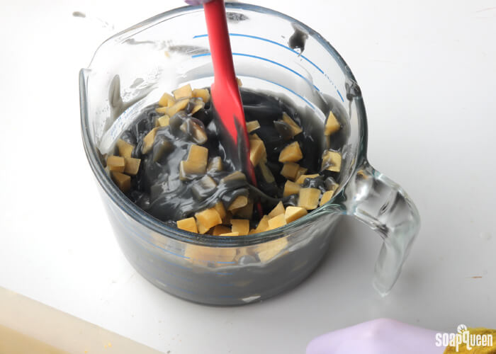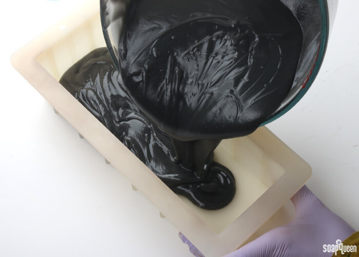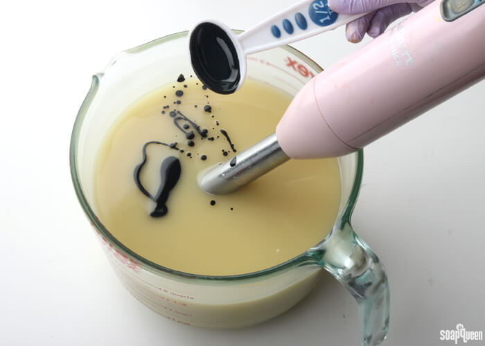 - Once the batter has reached a light trace, add 2.5 tablespoons of dispersed activated charcoal. Use a whisk to mix in the colorant.