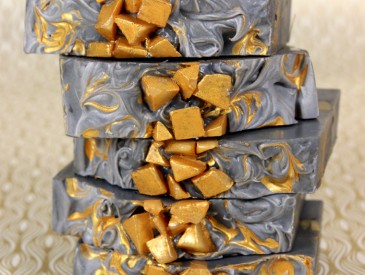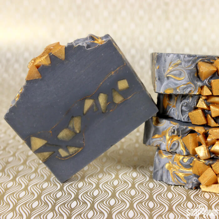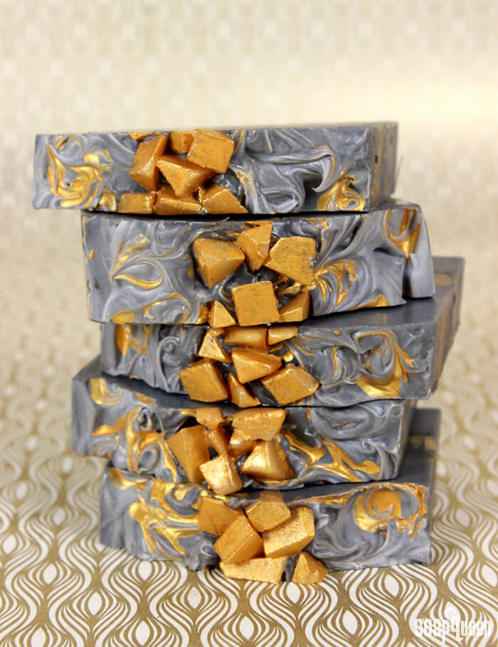 Crafty inspiration can come from anywhere. For the past few weeks, we have been sharing projects inspired by lots of shimmer and shine, including the Romantic Rose Gold Melt & Pour Bars and Sparkling Champagne Cold Process Cupcakes on Soap Queen TV. When brainstorming sparkly cold process designs, I began to think about how “sparkle” is made in nature. This led me to thinking about mining for gold…and voilà! The design for this project came together. See? Inspiration can really come from anywhere. =)