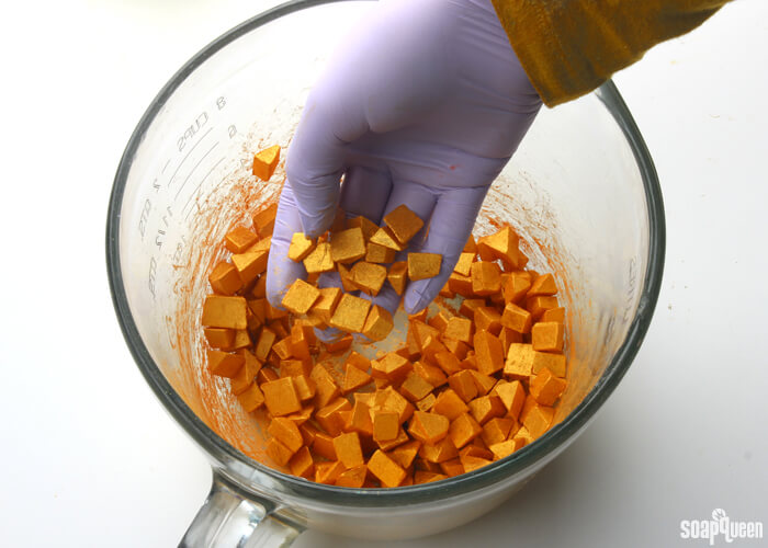 SAFETY FIRST: Suit up for safe handling practices! That means goggles, gloves and long sleeves. Make sure kids, pets, and other distractions and tripping hazards are out of the house or don’t have access to your soaping space. Always soap in a well-ventilated area.