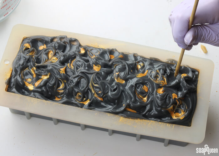 TWELVE: Insert a chopstick or dowel into the drops of dispersed mica and swirl them in various directions to create swirls throughout the bar. Do not insert the chopstick too far, you just want it to swirl the very top of the soap.