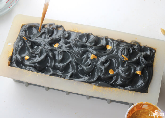 ELEVEN: Using a dropper, add drops of the dispersed King’s Gold Mica onto the top of the soap. Don’t worry too much about where each drop lands, just make sure they are somewhat evenly dispersed throughout the loaf.