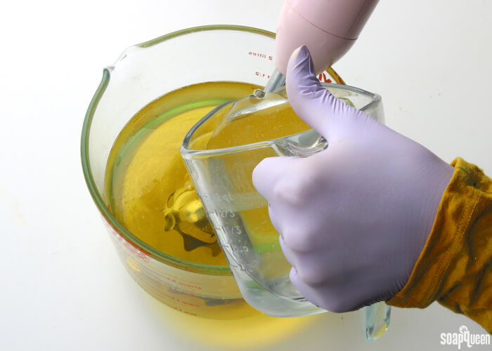 - Slowly and carefully add the lye to the water and gently stir until the lye has fully dissolved and the liquid is clear. Set aside to cool.