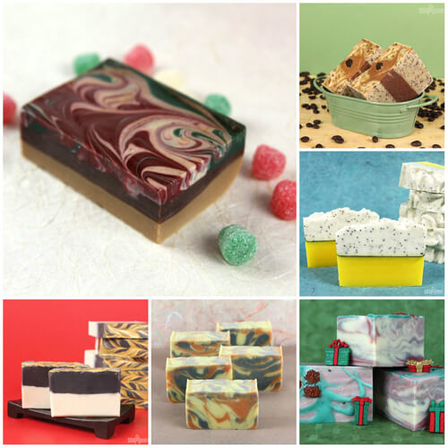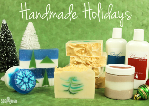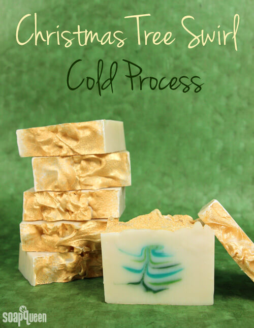If cold process is your preferred soaping method, the Christmas Tree Swirl features layers of green hues, topped with a sparkly gold top. Scented with the festive and woodsy Christmas Tree Cybilla Fragrance Oil, this cold process project is great for the advanced soaper. Because cold process needs to cure for four to six weeks, if you want to give cold process soap for the holidays, be sure to get started now!