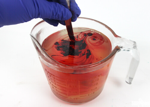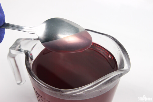 TWO: To test the color, dip a cold spoon into the wax. This allows you to see what the wax will look like after it cools and hardens. If necessary, add more Red Wax Dye Block until a red hue is achieved.