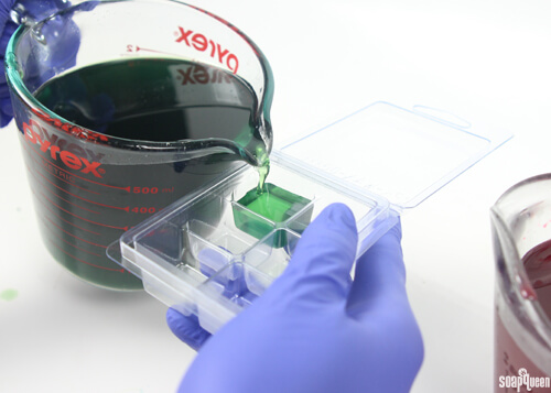 FIVE: Pour the green wax into every other cavity in the Small Cubes Mold and Packaging. Fill in the remaining cavities with the red wax. Set aside to fully cool and harden.