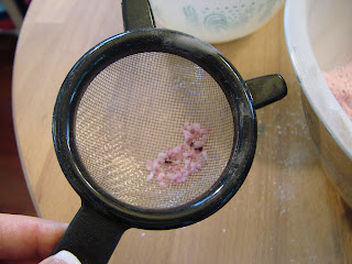 A large sifter is good for the first few strainings but when you’re down to the teensy knitty grit, a smaller sifter is better. Push, shove, and rub through the strainer until the last of your fragrance balls are evenly dispersed.