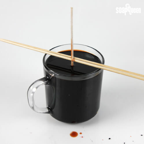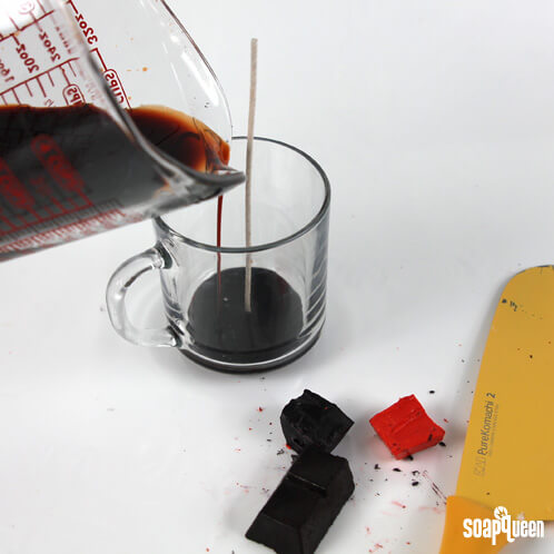 ONE: Melt 8 oz. of EcoSoya Advanced Wax on 30 second bursts in the microwave. Color the wax with equal portions of Red, Orange, and Black Wax Dye Block (a cleanup tool works well for shaving bits off the block) and stir until the dye pieces are completely melted.