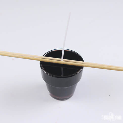 SEVEN: Fill flower pots almost to the brim with terra cotta wax. Use two pencils or chopsticks to hold wicks centered in the pot. Place each pot in a warm bath of water to help them to slowly cool.