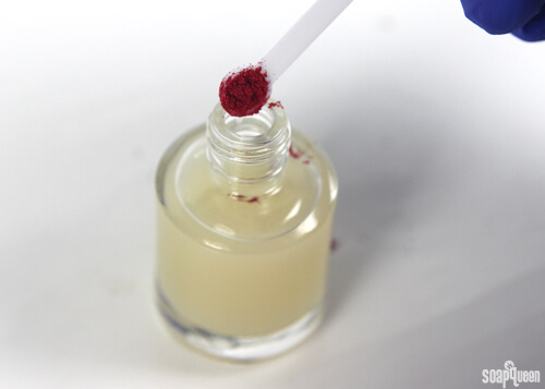 • To the second bottle, add 8 scoops Cellini Red Lip Safe Mica and 8 scoops Merlot Sparkle Mica.