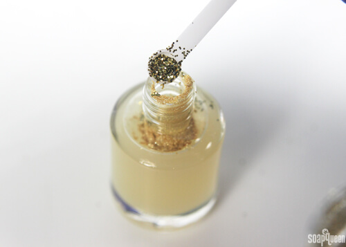 • To the third bottle, add 16 scoops Gold Sparkle Mica and 16 scoops Gold Nail Polish Glitter.