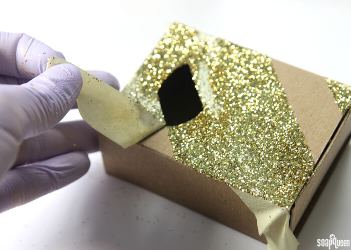 - Allow for glue to dry for several minutes. Then gently and slowly, peel away the tape. Allow the glue to thoroughly dry. We found that the glitter does continue to fall off the box a little. To help prevent this, you can spray the front of the box lightly with aerosol hairspray. Place soap in the box and enjoy!